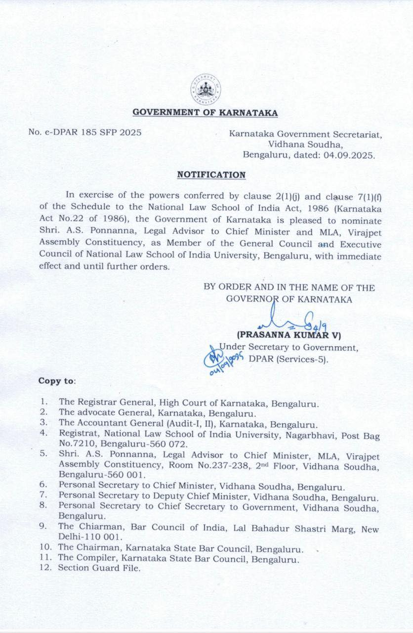 Many thanks to the Karnataka State Government for being appointed as the representative member of the prestigious National Law School General Board and Executive Committee., 04/09/2025