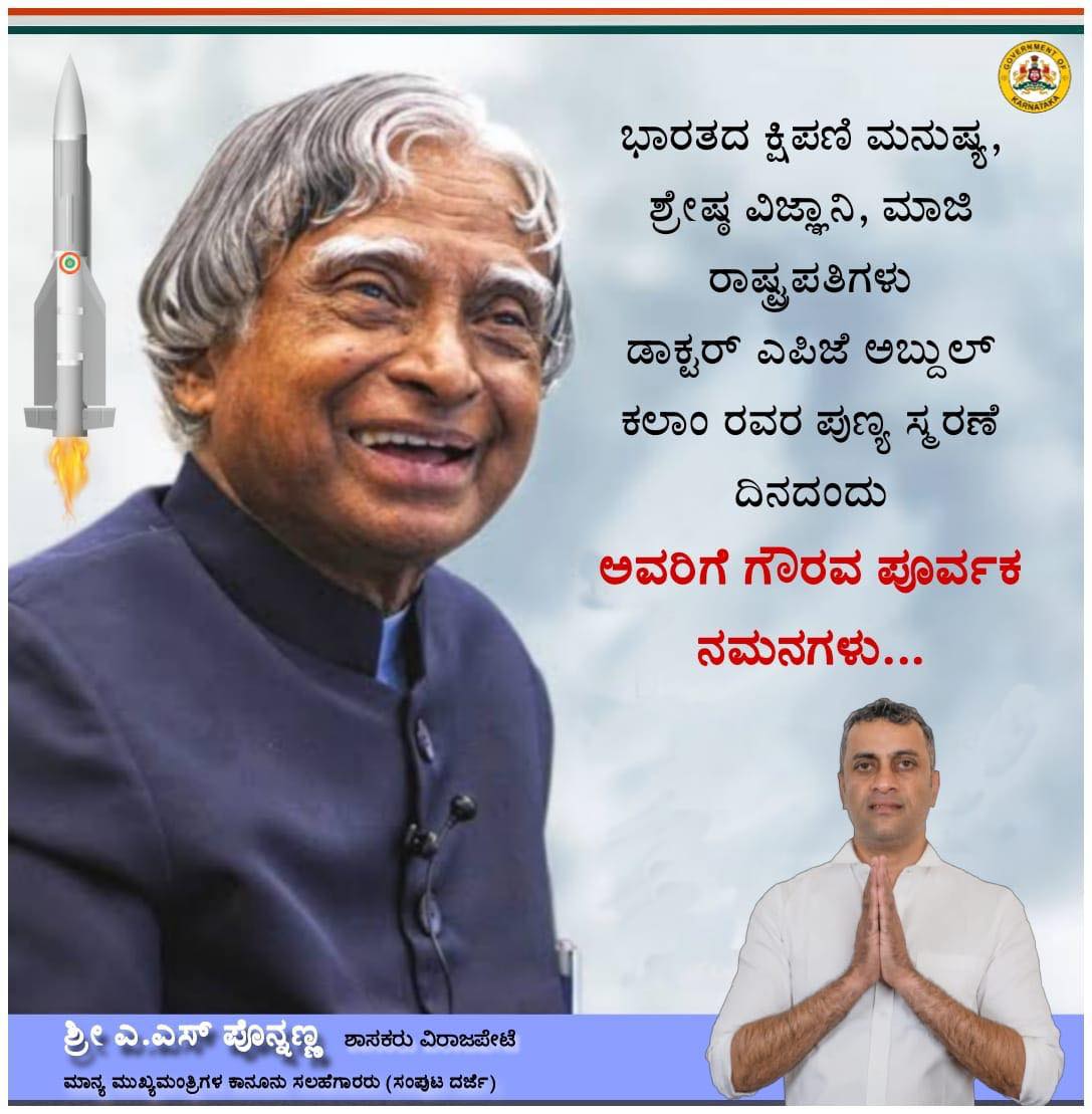 ಭಾರತದ ಕ್ಷಿಪಣಿ ಮನುಷ್ಯ, ಶ್ರೇಷ್ಠ ವಿಜ್ಞಾನಿ, ಮಾಜಿ ರಾಷ್ಟ್ರಪತಿಗಳು ಡಾಕ್ಟರ್ ಎಪಿಜೆ ಅಬ್ದುಲ್ ಕಲಾಂ ರವರ ಪುಣ್ಯ ಸ್ಮರಣೆ ದಿನದಂದು ಅವರಿಗೆ ಗೌರವ ಪೂರ್ವಕ ನಮನಗಳು.