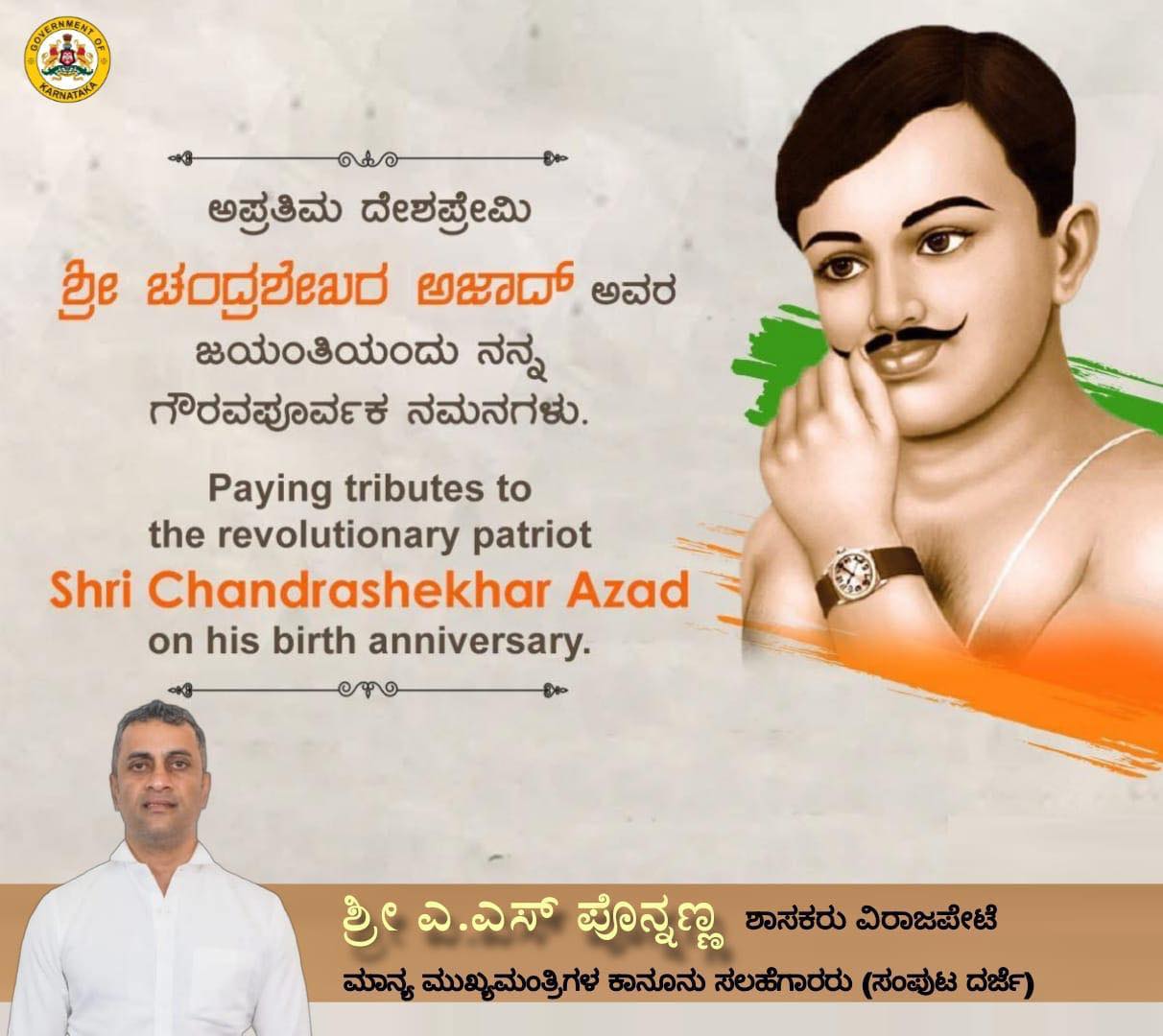 ಅಪ್ರತಿಮ ದೇಶಪ್ರೇಮಿ ಶ್ರೀ ಚಂದ್ರಶೇಖರ ಅಜಾದ್ ಅವರ ಜಯಂತಿಯಂದು ನನ್ನ ಗೌರವಪೂರ್ವಕ ನಮನಗಳು