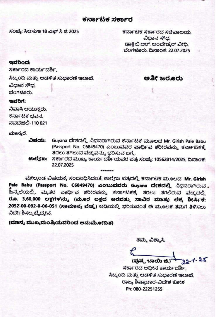 State government has given financial assistance to bring the body of Girish Pale Babu, Madenadu village, Virajpet assembly constituency, who died in Guyana, America. Heartfelt thanks to the Honorable Chief Minister who responded to our request., 23/07/2025
