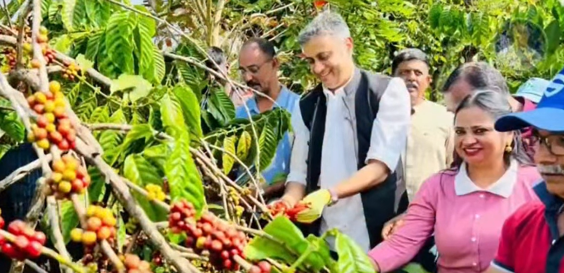 Coffee harvesting program for journalists was launched at Cheranda Jagan's coffee garden in cooperation with Kodagu district busy journalists association and Virajpet Taluk busy journalists association, 04/01/2026