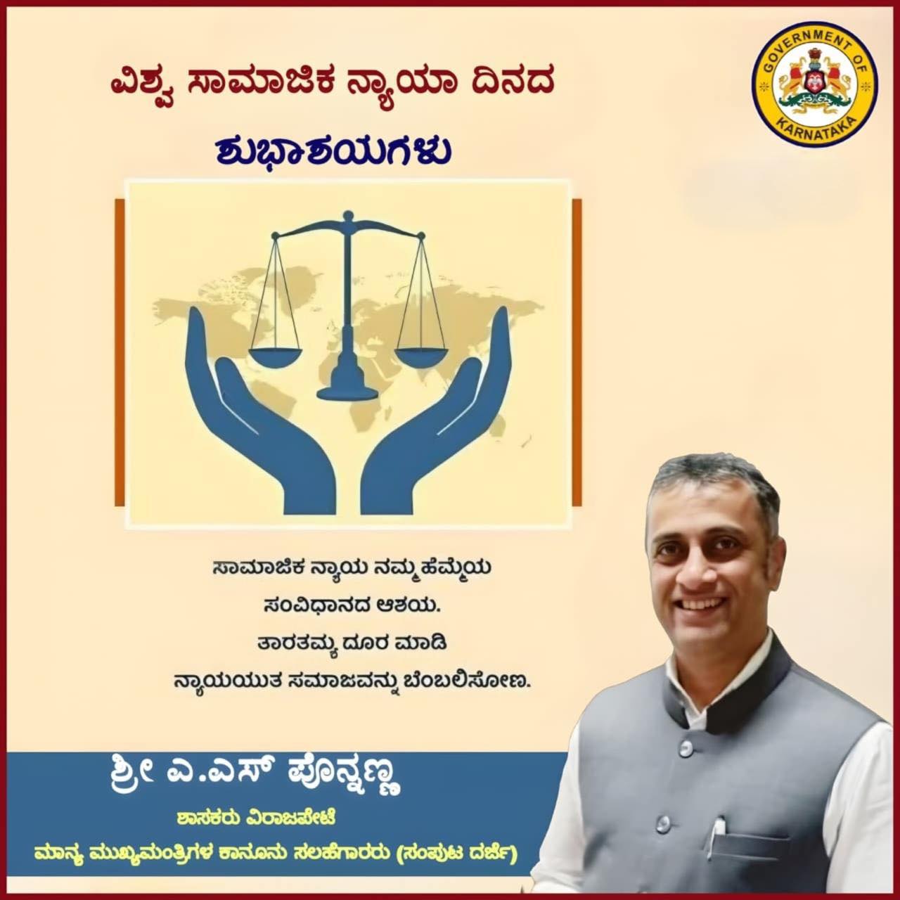 ವಿಶ್ವ ಸಾಮಾಜಿಕ ನ್ಯಾಯ ದಿನದದಂದು ಸಾಮಾಜಿಕ ನ್ಯಾಯ ನಮ್ಮ ಹೆಮ್ಮೆಯ ಸಂವಿಧಾನದ ಆಶಯ. ತಾರತಮ್ಯ ದೂರ ಮಾಡಿ ನ್ಯಾಯಯುತ ಸಮಾಜವನ್ನು ಬೆಂಬಲಿಸೋಣ.