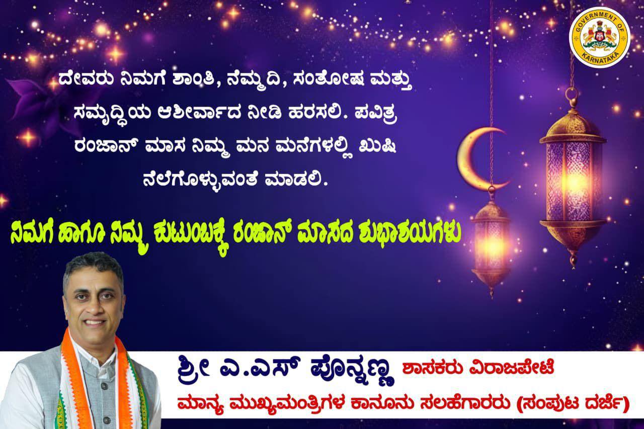 ದೇವರು ನಿಮಗೆ ಶಾಂತಿ, ನೆಮ್ಮದಿ, ಸಂತೋಷ ಮತ್ತು ಸಮೃದ್ಧಿಯ ಆಶೀರ್ವಾದ ನೀಡಿ ಹರಸಲಿ. ಪವಿತ್ರ ರಂಜಾನ್ ಮಾಸ ನಿಮ್ಮ ಮನ ಮನೆಗಳಲ್ಲಿ ಖುಷಿ ನೆಲೆಗೊಳ್ಳುವಂತೆ ಮಾಡಲಿ.