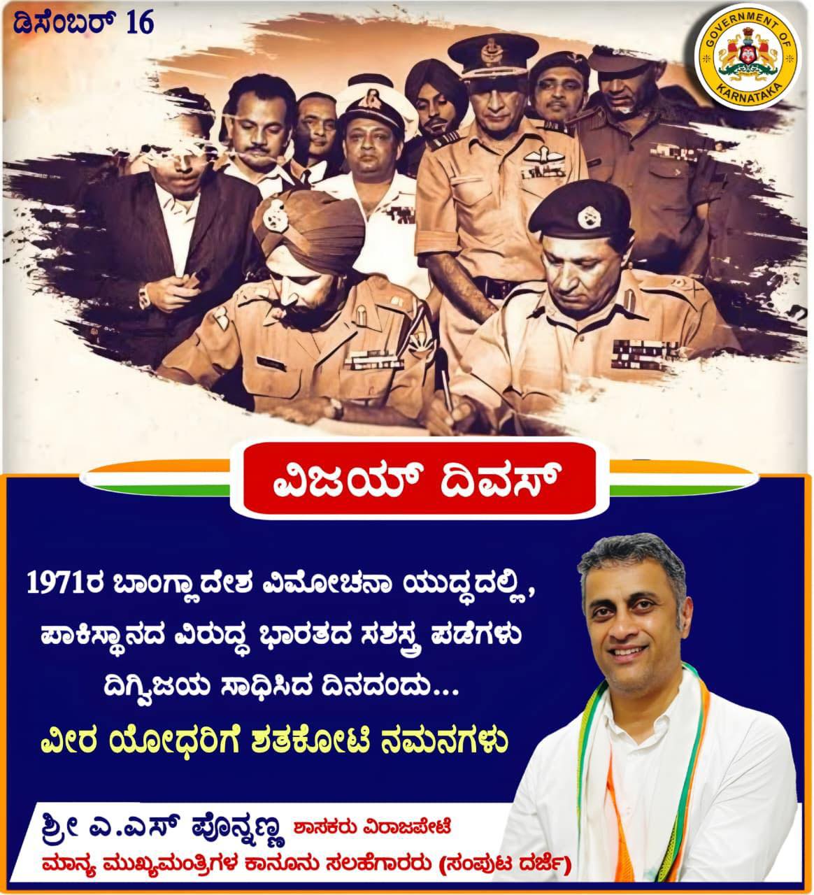 1971ರ ಬಾಂಗ್ಲಾದೇಶ ವಿಮೋಚನಾ ಯುದ್ಧದಲ್ಲಿ, ಪಾಕಿಸ್ಥಾನದ ವಿರುದ್ಧ ಭಾರತದ ಸಶಸ್ತ್ರ ಪಡೆಗಳು ದಿಗ್ವಿಜಯ ಸಾಧಿಸಿದ ದಿನದಂದು ವೀರ ಯೋಧರಿಗೆ ಶತಕೋಟಿ ನಮನಗಳು.