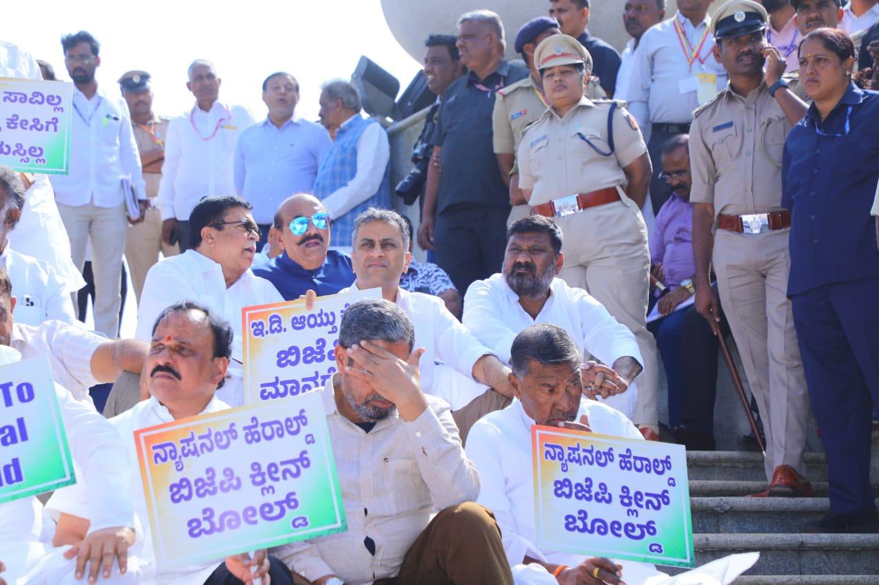 ಬೆಳಗಾವಿ ಸುವರ್ಣ ಸೌಧದ ಗಾಂಧಿ ಪ್ರತಿಮೆ ಮುಂಭಾಗ, ಕರ್ನಾಟಕ ಪ್ರದೇಶ ಕಾಂಗ್ರೆಸ್ ಸಮಿತಿ ವತಿಯಿಂದ, ಶ್ರೀಮತಿ ಸೋನಿಯಾ ಗಾಂಧಿ ಹಾಗೂ ಶ್ರೀ ರಾಹುಲ್ ಗಾಂಧಿ ವಿರುದ್ಧ *ನ್ಯಾಷನಲ್ ಹೆರಾಲ್ಡ್ ಸುಳ್ಳು ಕೇಸ್* ಸಂಬಂಧವಾಗಿ, ಕೇಂದ್ರ ಬಿಜೆಪಿ ಸರ್ಕಾರದ ವಿರುದ್ಧ, ಮಾನ್ಯ ಮುಖ್ಯಮಂತ್ರಿಗಳಾದ ಶ್ರೀ ಸಿದ್ದರಾಮಯ್ಯ ಅವರು ಹಾಗೂ ಉಪಮುಖ್ಯಮಂತ್ರಿಗಳಾದ ಶ್ರೀ ಡಿಕೆ ಶಿವಕುಮಾರ್ ಅವರ ನೇತೃತ್ವದಲ್ಲಿ ನಡೆದ ಪ್ರತಿಭಟನೆಯಲ್ಲಿ ಭಾಗವಹಿಸಲಾಯಿತು.