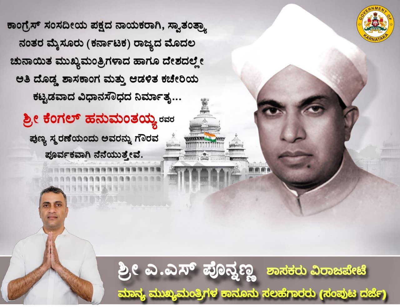 ಶ್ರೀ ಕೆಂಗಲ್ ಹನುಮಂತಯ್ಯ ರವರ ಪುಣ್ಯ ಸ್ಮರಣೆಯಂದು ಅವರನ್ನು ಗೌರವ ಪೂರ್ವಕವಾಗಿ ನೆನೆಯುತ್ತೇವೆ.