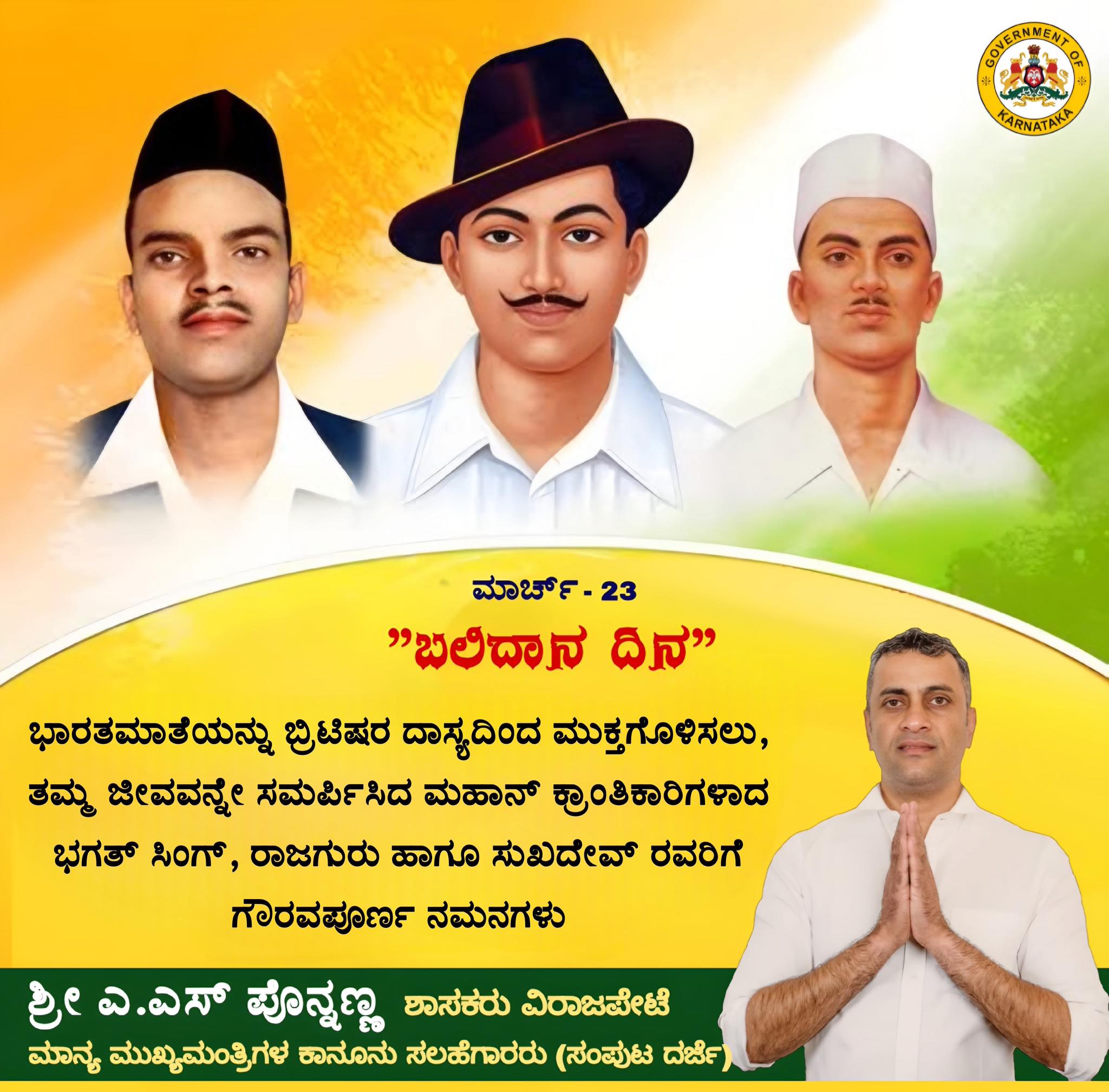 ಭಾರತಮಾತೆಯನ್ನು ಬ್ರಿಟಿಷರ ದಾಸ್ಯದಿಂದ ಮುಕ್ತಗೊಳಿಸಲು, ತಮ್ಮ ಜೀವವನ್ನೇ ಸಮರ್ಪಿಸಿದ ಮಹಾನ್ ಕ್ರಾಂತಿಕಾರಿಗಳಾದ ಭಗತ್ ಸಿಂಗ್, ರಾಜಗುರು ಹಾಗೂ ಸುಖದೇವ್ ರವರಿಗೆ ಗೌರವಪೂರ್ಣ ನಮನಗಳು.