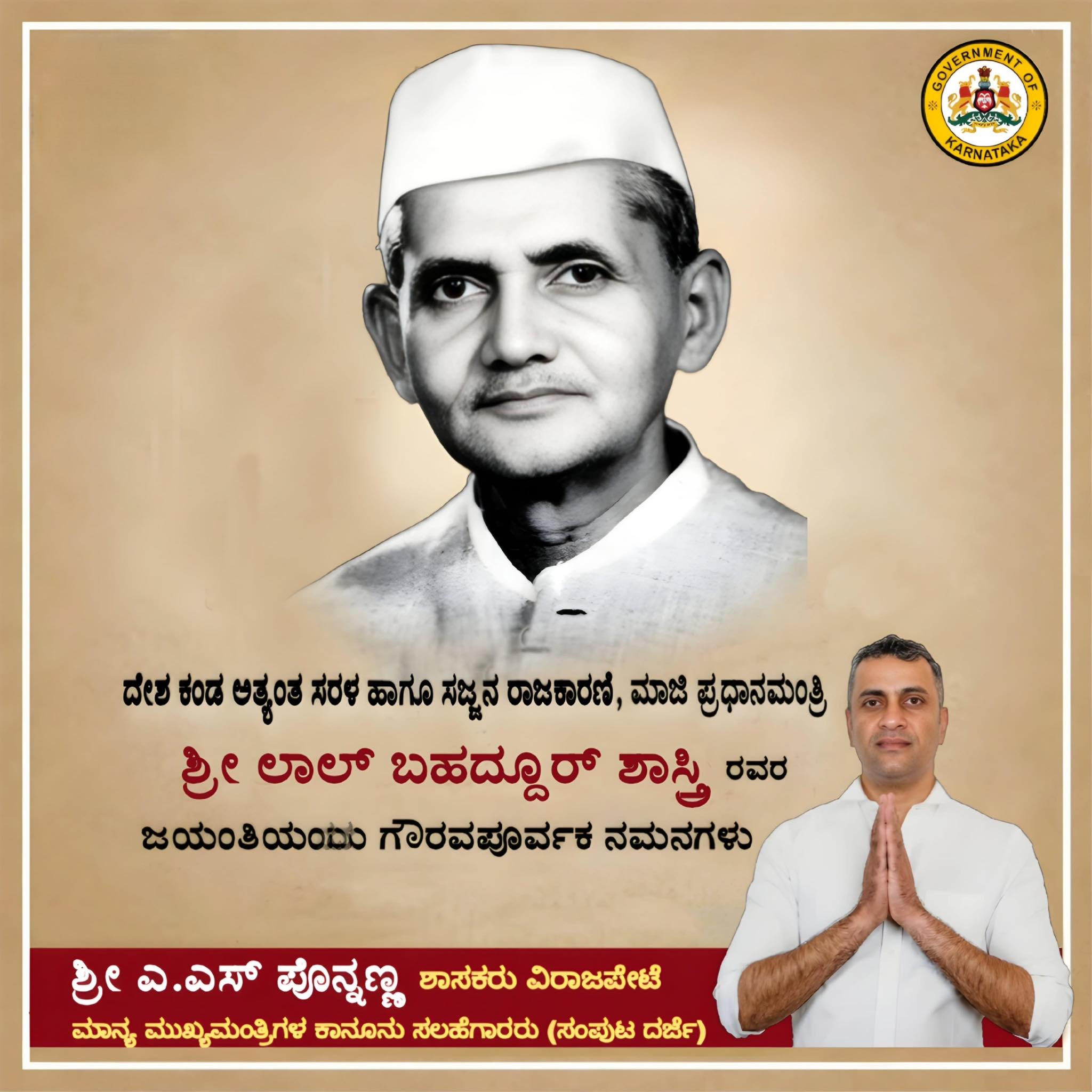 ದೇಶ ಕಂಡ ಅತ್ಯಂತ ಸರಳ ಹಾಗೂ ಸಜ್ಜನ ರಾಜಕಾರಣಿ, ಮಾಜಿ ಪ್ರಧಾನಮಂತ್ರಿ ಶ್ರೀ ಲಾಲ್ ಬಹದ್ದೂರ್ ಶಾಸ್ತ್ರಿ ರವರ ಜಯಂತಿಯಂದು ಗೌರವಪೂರ್ವಕ ನಮನಗಳು.