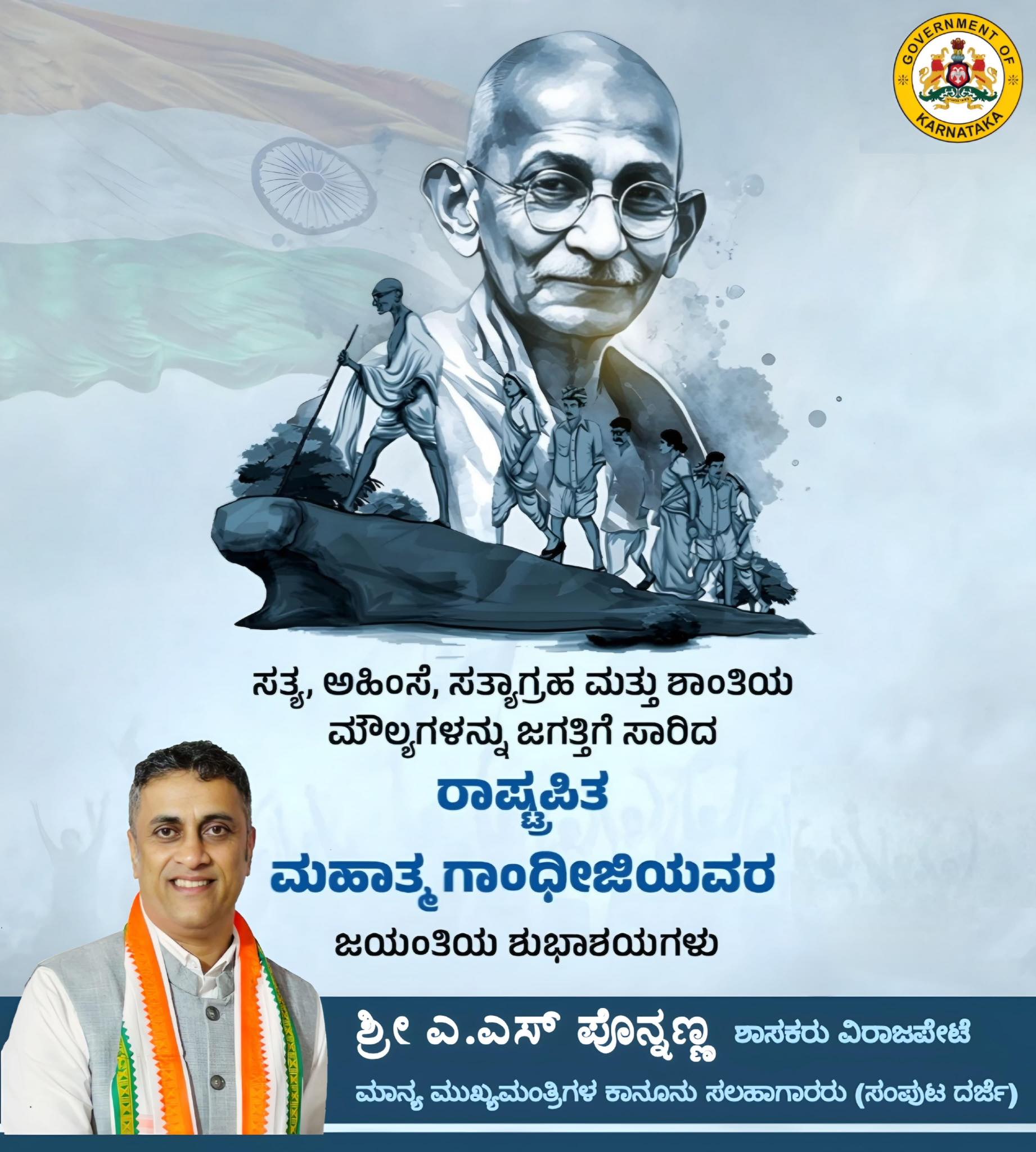 ಸತ್ಯ, ಅಹಿಂಸೆ, ಸತ್ಯಾಗ್ರಹ ಮತ್ತು ಶಾಂತಿಯ ಮೌಲ್ಯಗಳನ್ನು ಜಗತ್ತಿಗೆ ಸಾರಿದ ರಾಷ್ಟ್ರಪಿತ ಮಹಾತ್ಮ ಗಾಂಧೀಜಿಯವರ ಜಯಂತಿಯ ಶುಭಾಶಯಗಳು.