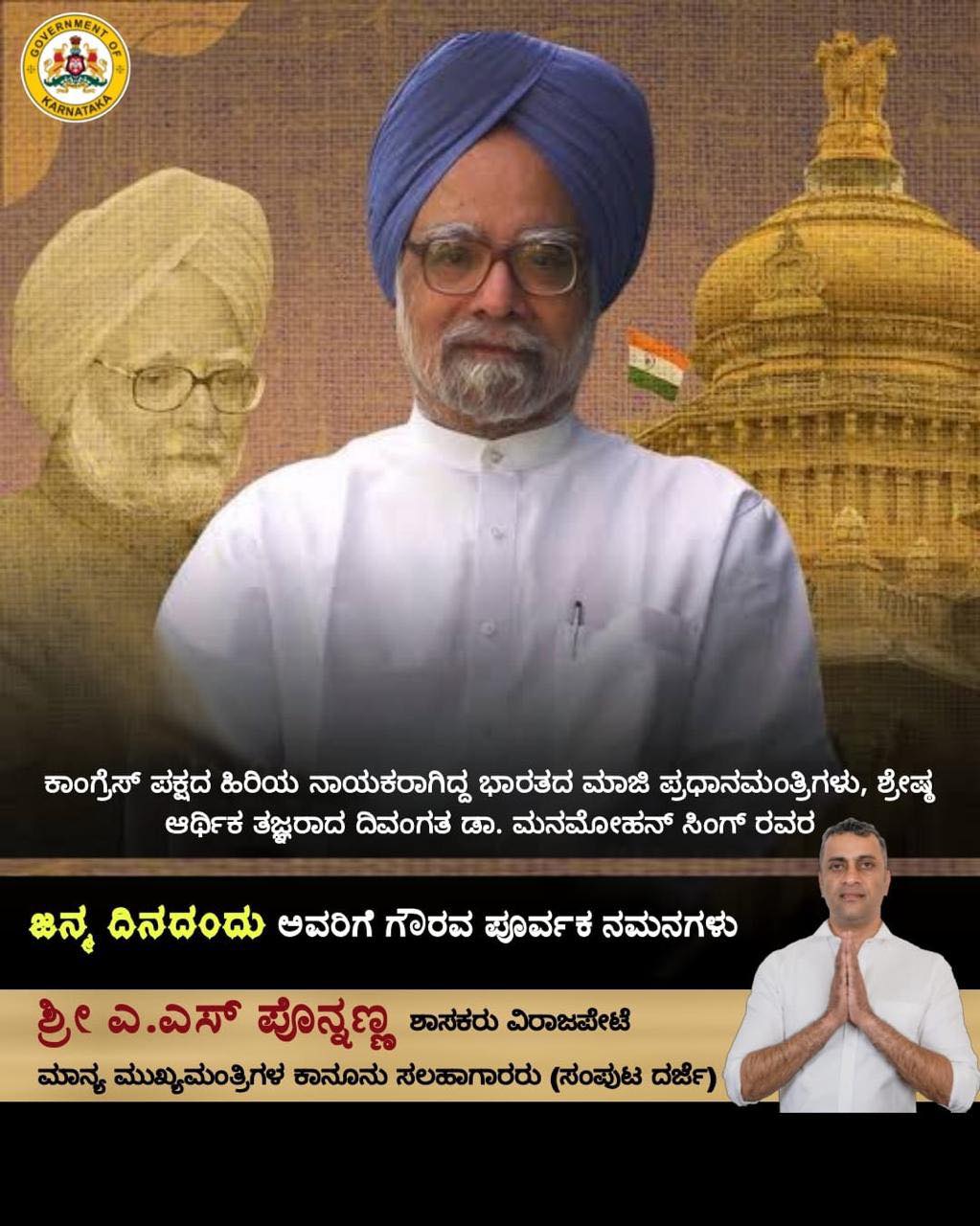 ಕಾಂಗ್ರೆಸ್‌ ಪಕ್ಷದ ಹಿರಿಯ ನಾಯಕರಾಗಿದ್ದ ಭಾರತದ ಮಾಜಿ ಪ್ರಧಾನಮಂತ್ರಿಗಳು, ಶ್ರೇಷ್ಠ ಆರ್ಥಿಕ ತಜ್ಞರಾದ ದಿವಂಗತ ಡಾ. ಮನಮೋಹನ್ ಸಿಂಗ್ ರವರ ಜನ್ಮ ದಿನದಂದು ಅವರಿಗೆ ಗೌರವ ಪೂರ್ವಕ ನಮನಗಳು.