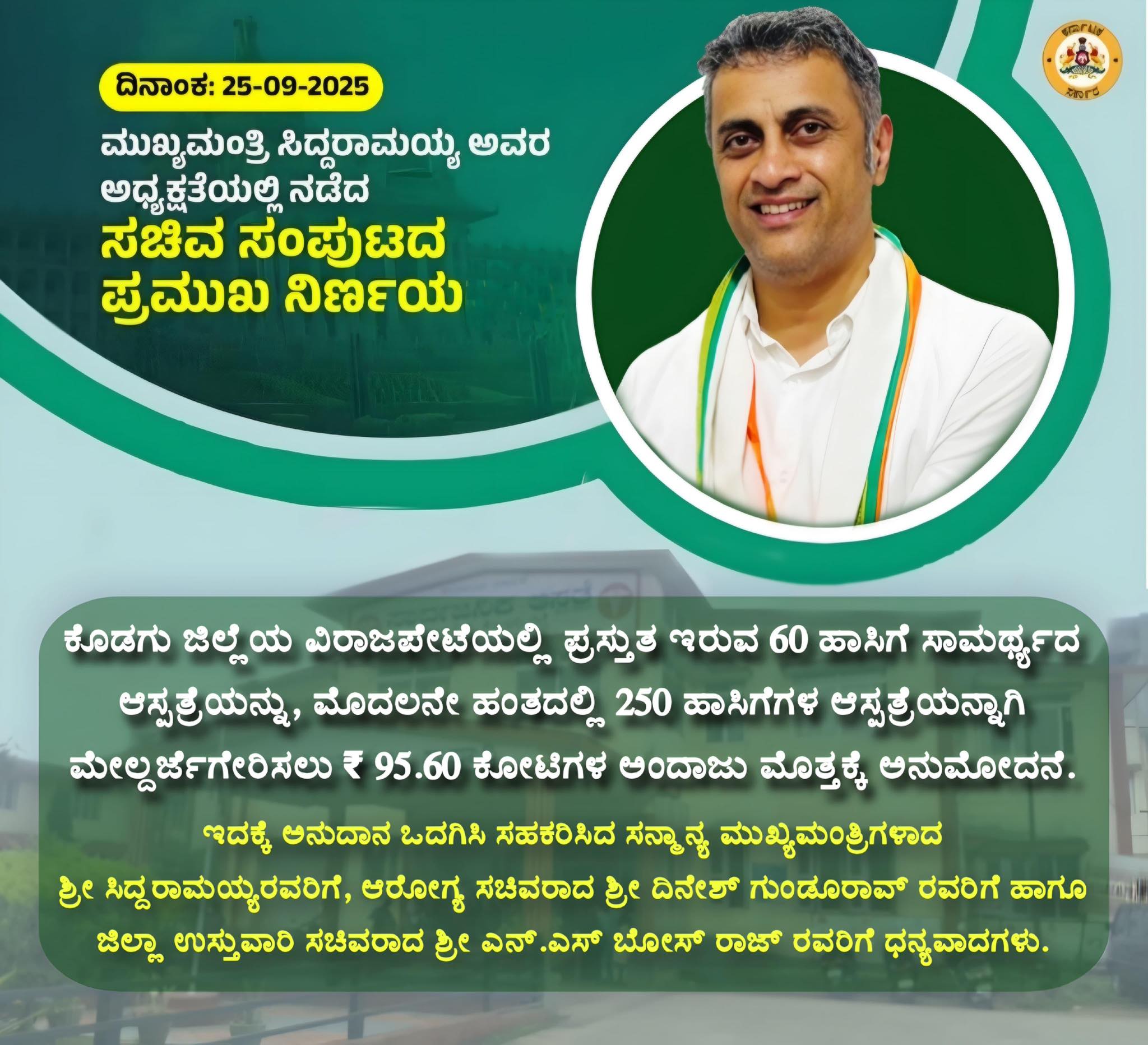 Approval to an estimated amount of ₹95.60 crores to upgrade the current 60 bed capacity hospital in Virajapete of Kodagu district to 250 bed hospital in the first phase. To the Honorable Chief Minister Shri Siddaramaiah, Health Minister Shri Dinesh Gundur, 25/09/2025